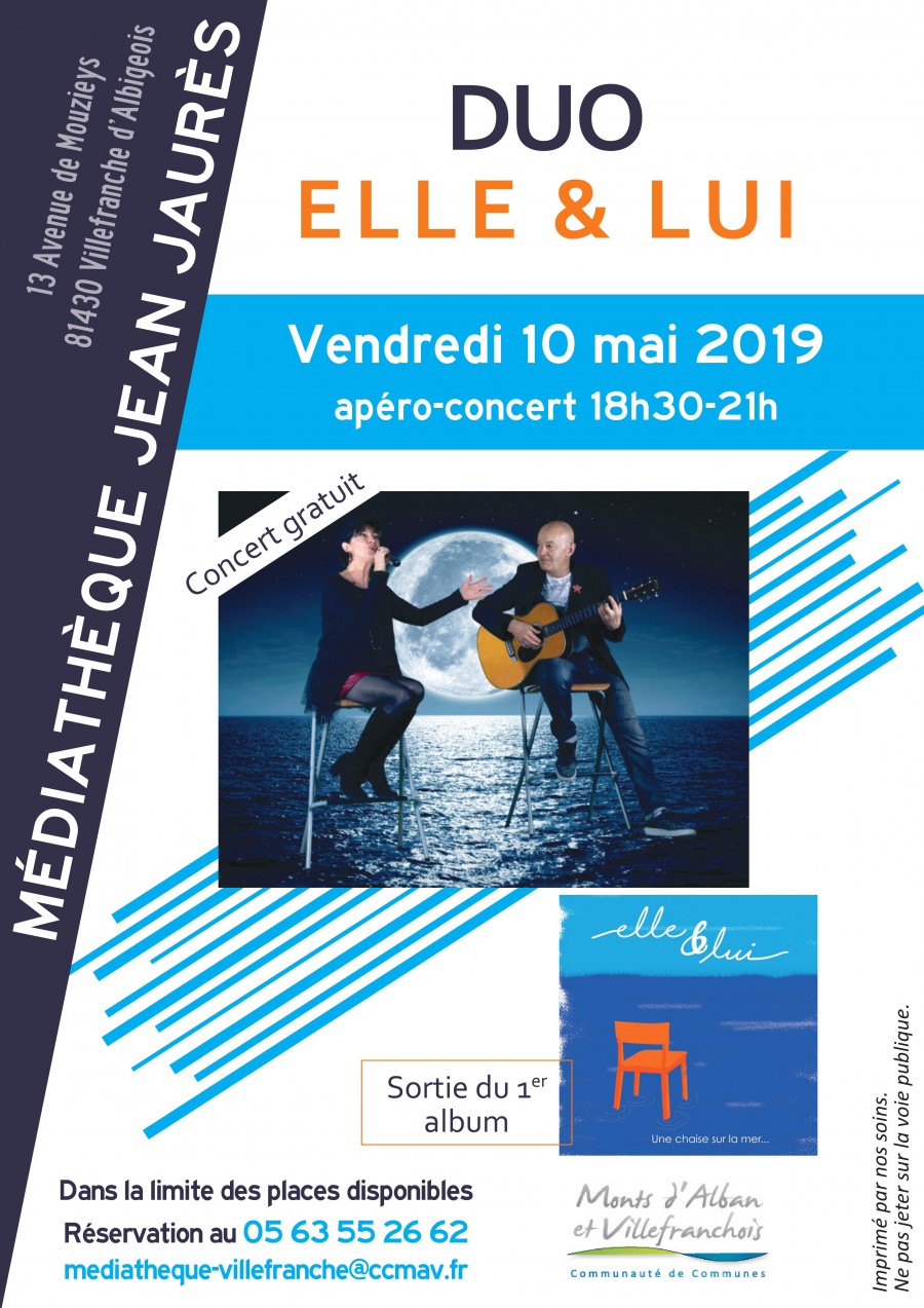 VILLEFRANCHE D’ALBIGEOIS/MEDIATHEQUE JEAN JAURESAPERO-CONCERT GRATUIT AVEC LE DUO « ELLE &LUIVENDREDI 10 MAI 2019 18h30-21HDeux univers musicaux : Elle, Agnès, amoureuse des mots et de la belle chanson française qu’elle a chantée dans diverses formations musicales. Lui, Pascal, guitariste de Blues-Rock a longtemps promené sa strato sur les scènes tarnaises. Naissance d’une belle alchimie riche de ces influences, un univers s’est écrit peu à peu, au fil de leurs créations originales. Elle, Lui, tour à tour ou ensemble, pour les mots et les notes. Leur premier album « Une chaise sur la mer » a accosté sur les terres albigeoises à l’aube de cette année 2019 ; il délivre tout en délicatesse et sobriété des embruns d’enfance, du temps qui s’échappe et que le quotidien rattrape, des pétillances, des notes bleues, des parfums poétiques. « Une chaise sur la mer », comme un voyageCet apéro-concert aura lieu dans la salle d’exposition de la médiathèque Jean Jaurès, dans la limite des places disponibles. N’oubliez pas de réserver. Contact : 13 avenue de Mouzieys 05 63 55 26 62 mediatheque-villefranche@ccmav.fr