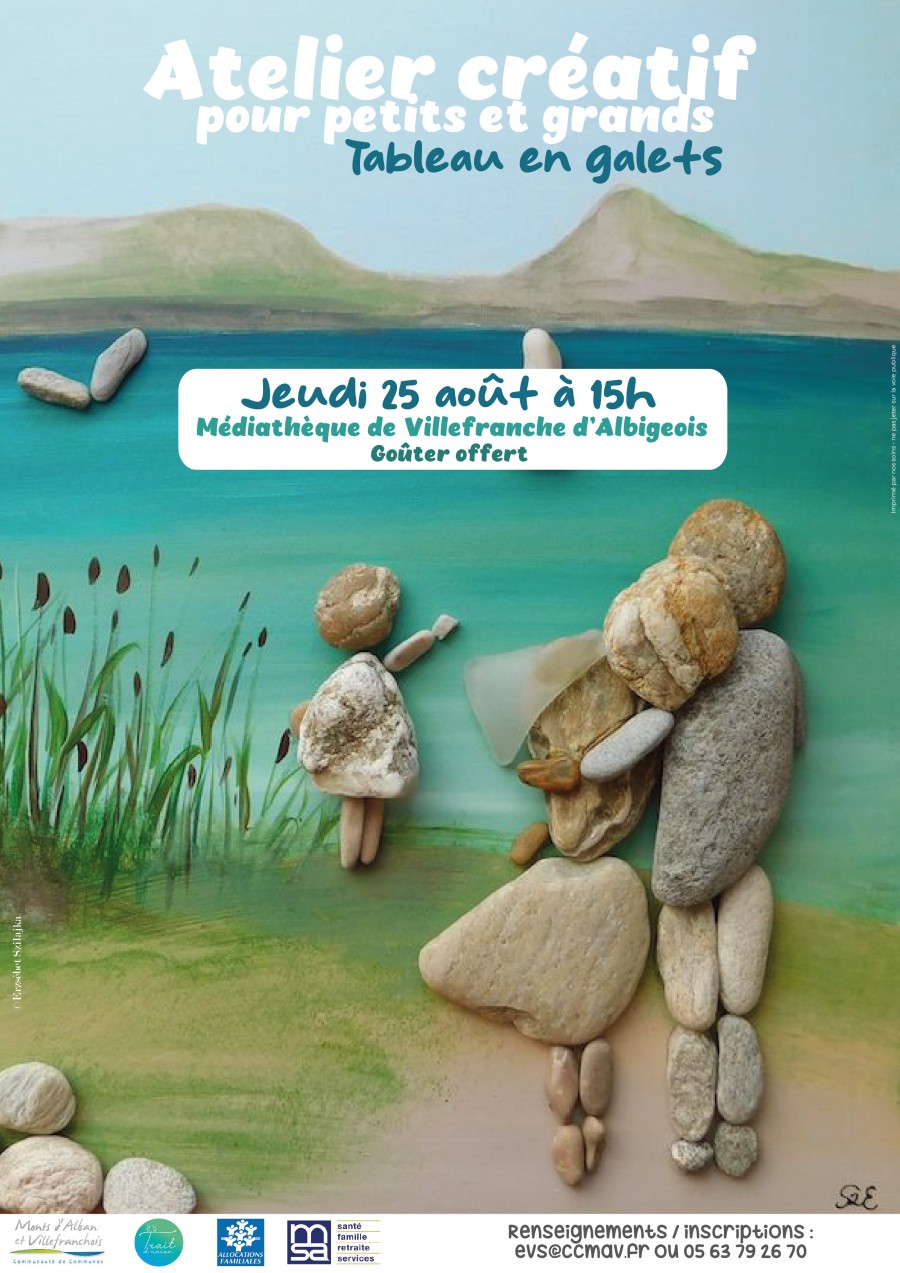 - à 15h, à la médiathèque de Villefranche d'Albigeois (salle d'exposition) - Ateliers créatifs pour petits et grands avec la réalisation de tableaux en galets Animation organisée par le Trait d'Union, gratuite et ouverte à tous.Renseignements et inscriptions : evs@ccmav.fr - 05 63 79 26 70